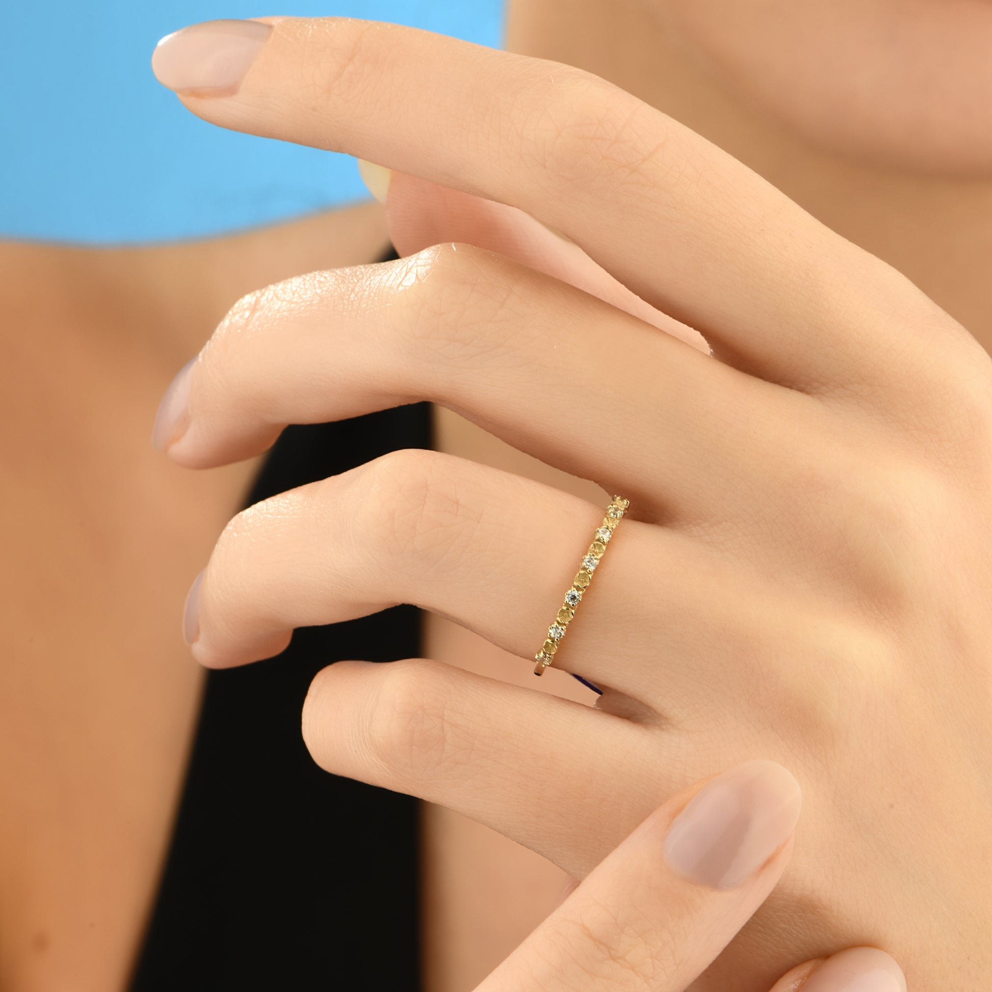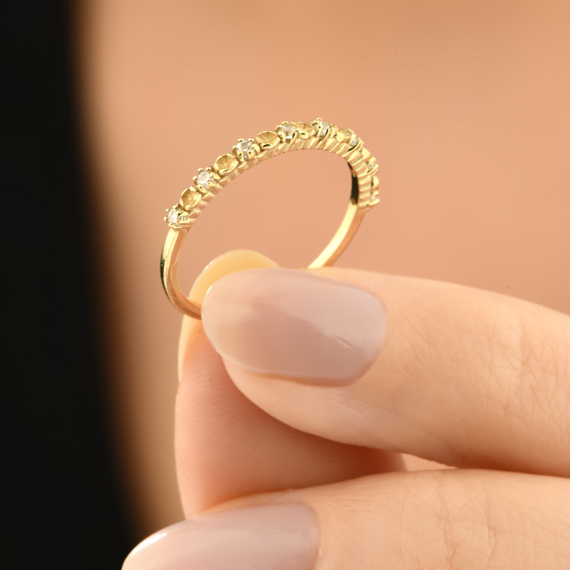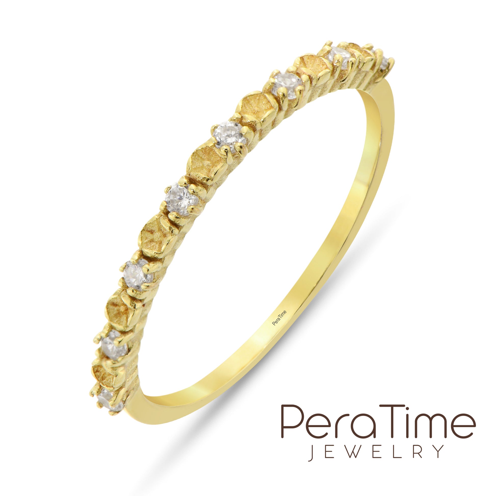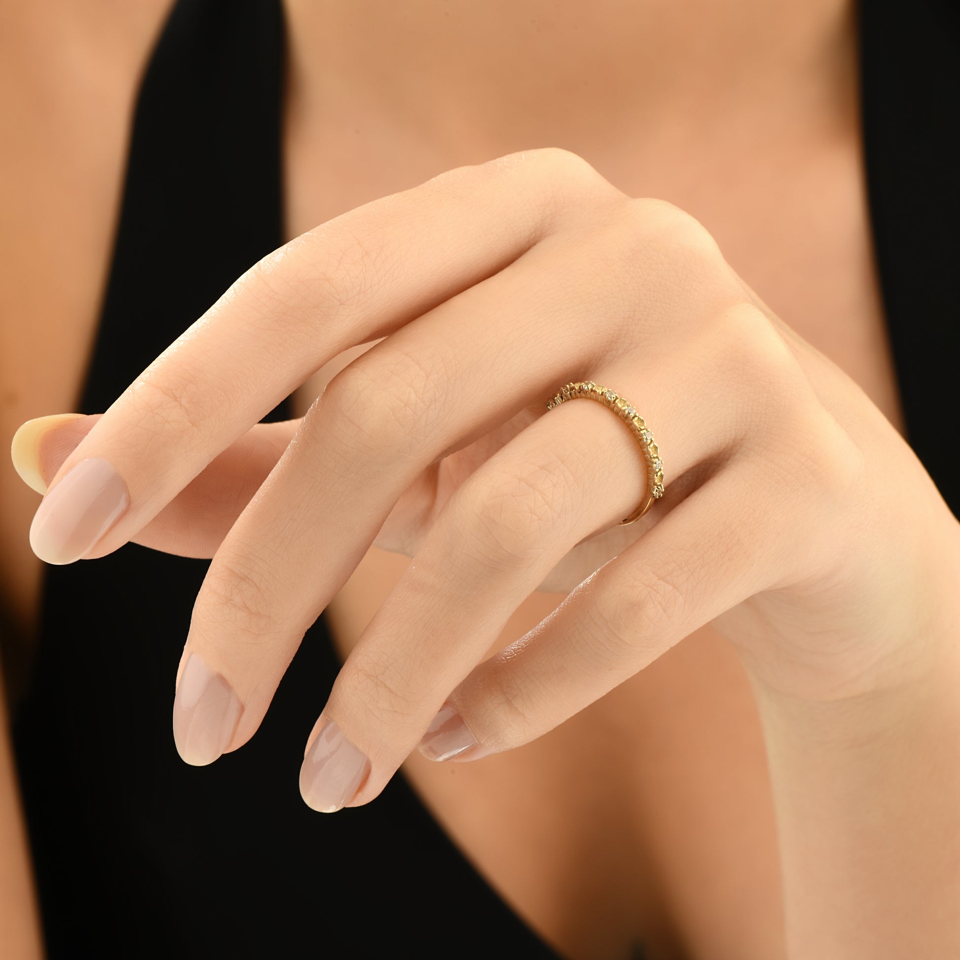 Doğadan ilham alan zarif tasarımıyla bu yüzük, çiçek motifinin estetiğini ışıltılı taş detaylarıyla buluşturuyor. 14 ayar altının parlaklığıyla göz kamaştıran model, hem günlük kullanımda zarif bir dokunuş hem de özel günlerde şıklığınızı tamamlayan sofistike bir aksesuar sunar. Romantik ve zarif çizgileriyle sevdiklerinize hediye edebileceğiniz anlamlı bir parça olmasının yanı sıra, koleksiyonunuzun da en özel yüzüklerinden biri olacak.