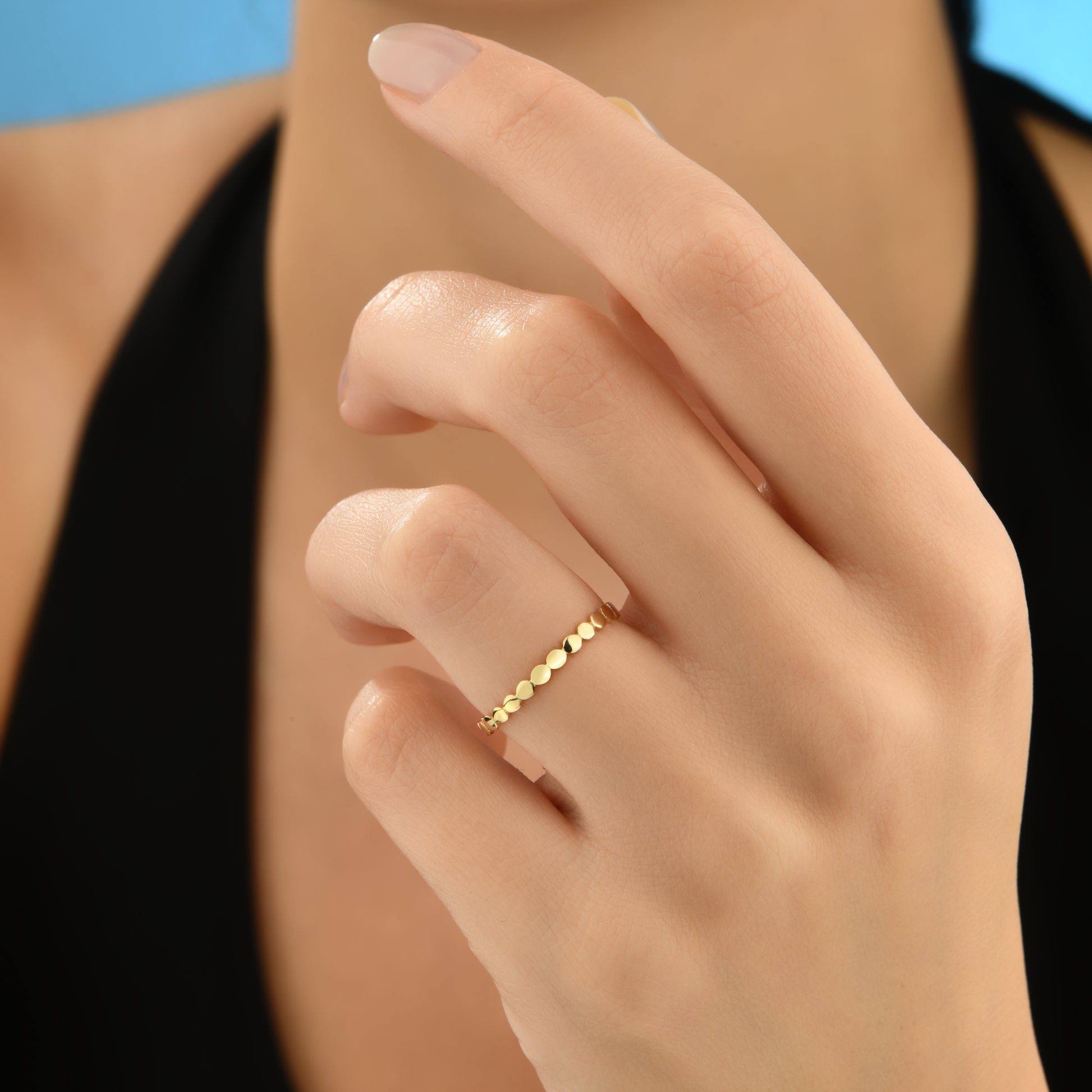 Zarafet ve modern tasarımı bir araya getiren düz boncuklu altın yüzük, stilinizi yükseltmek için mükemmel bir minimalist dokunuş! Narin ve hafif yapısı gün boyu rahatlık sağlarken, cilalı yüzeyi ışığı güzel bir şekilde yakalayarak onu gerçek bir göz alıcı yapar.