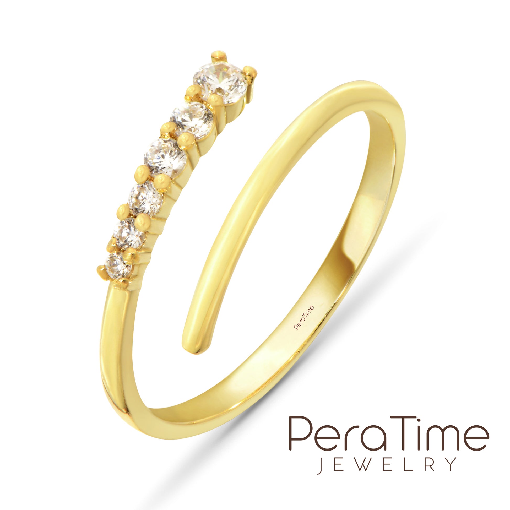 PeraTime 14 ayar taşlı spiral altın yüzük, modern spiral formuyla dikkat çekerken üzerindeki zarif taş detaylarıyla da ışıltı katıyor. Parmakta şık ve dinamik bir duruş sergileyen bu tasarım, hem günlük kullanıma hem de özel davetlere uyum sağlar.