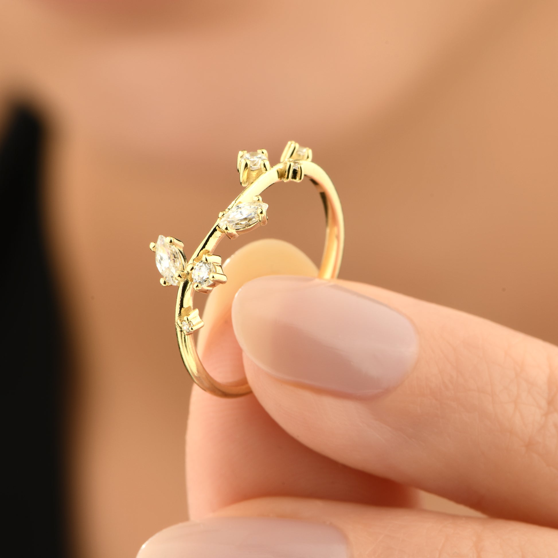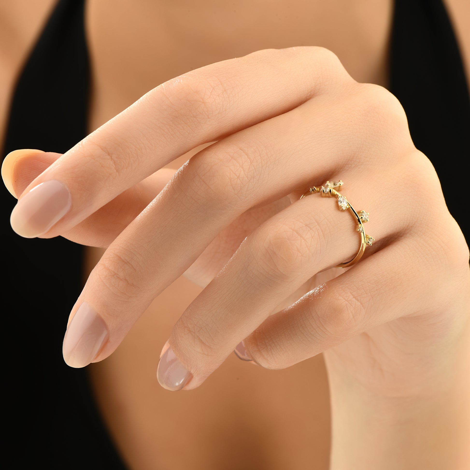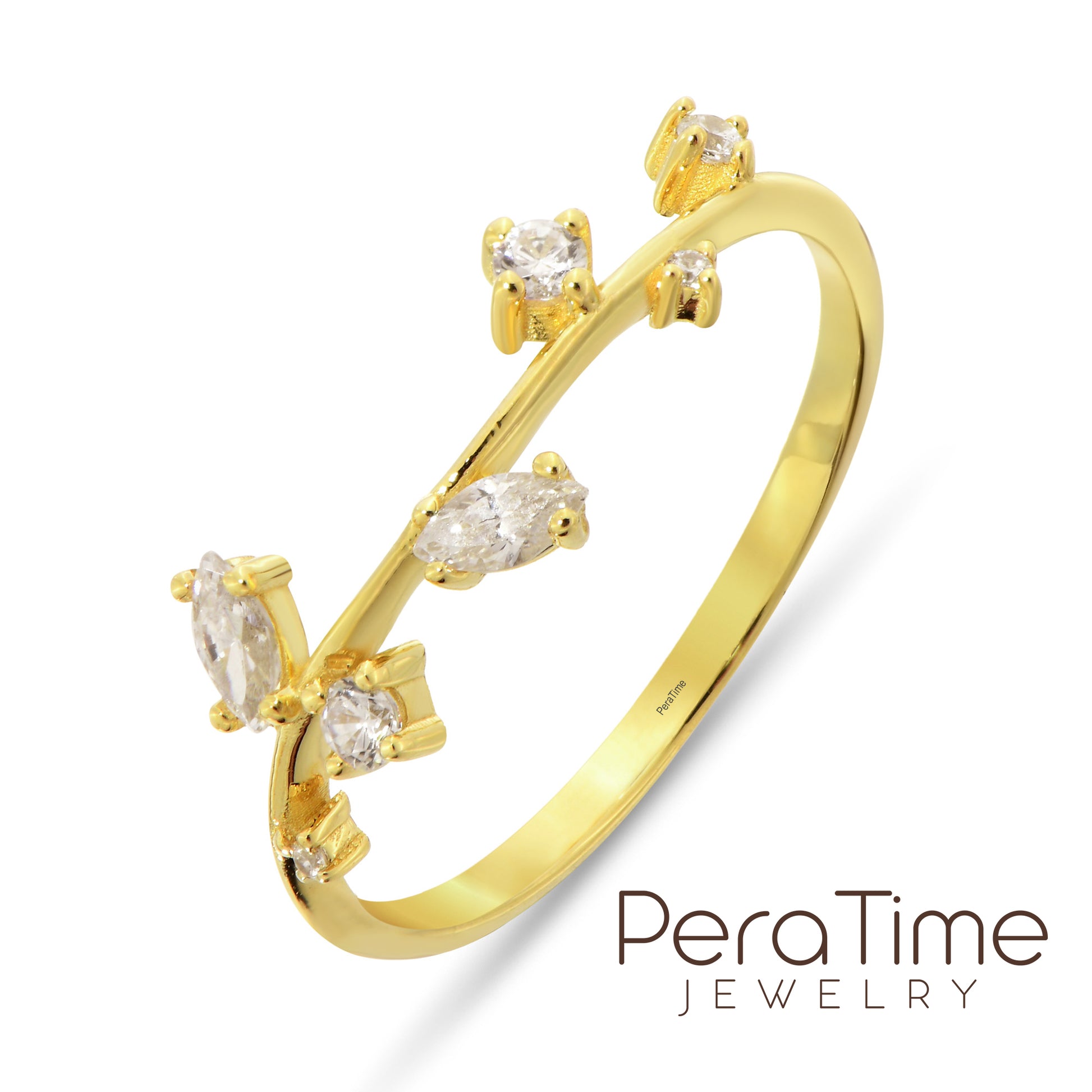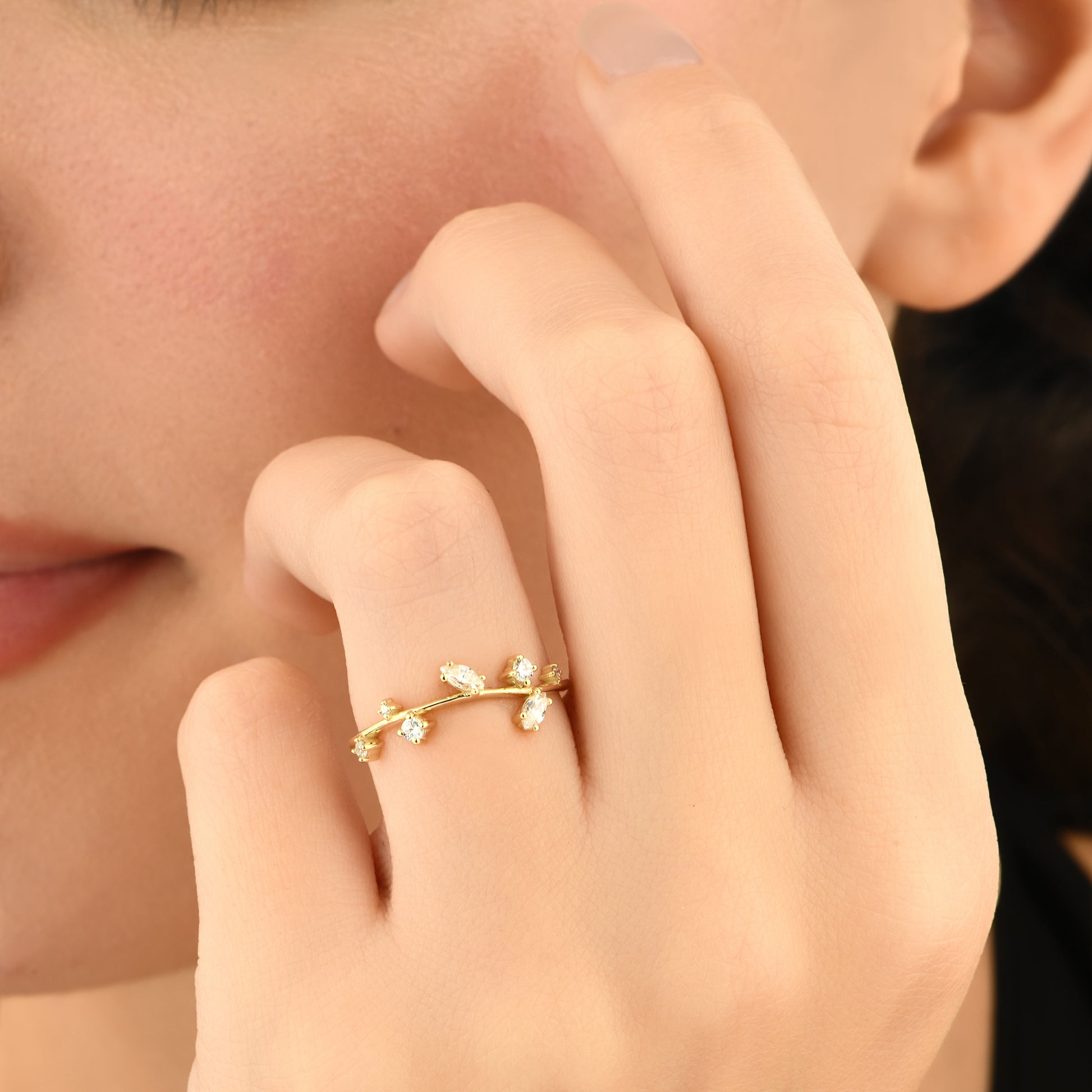 Doğadan ilham alınarak tasarlanmış, 14 ayar taşlı yaprak altın yüzük.