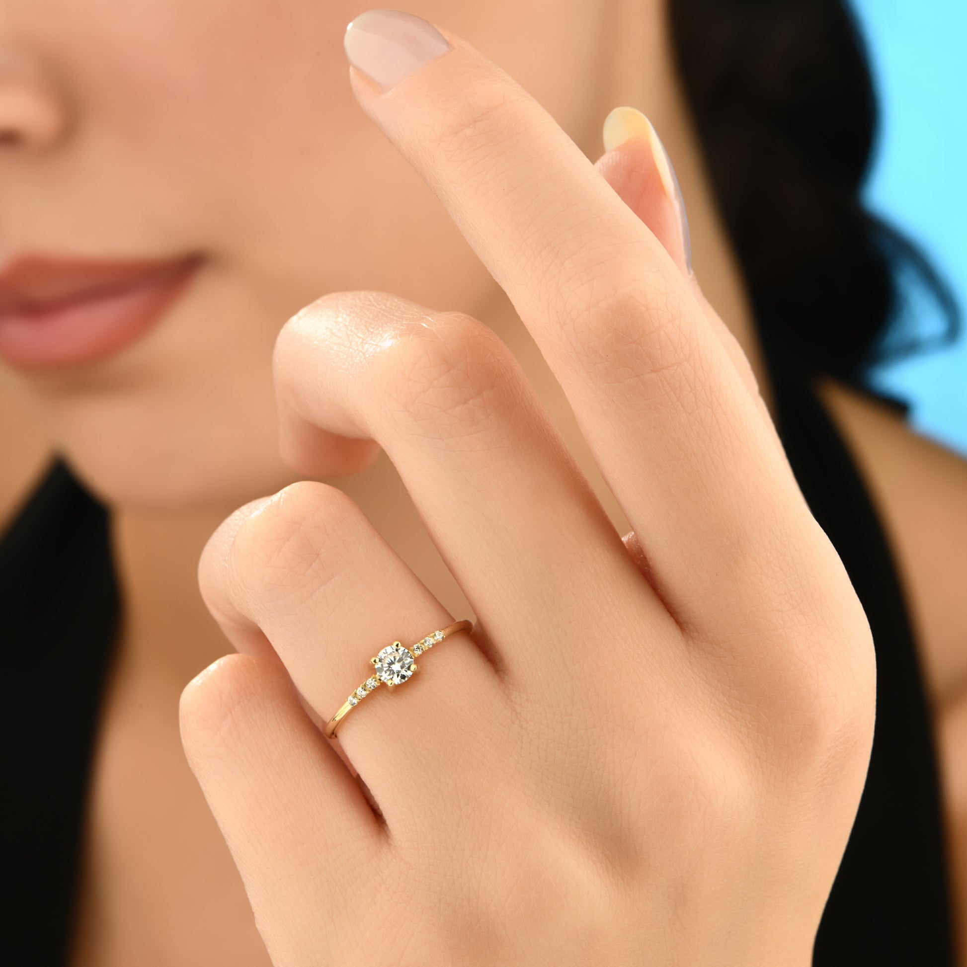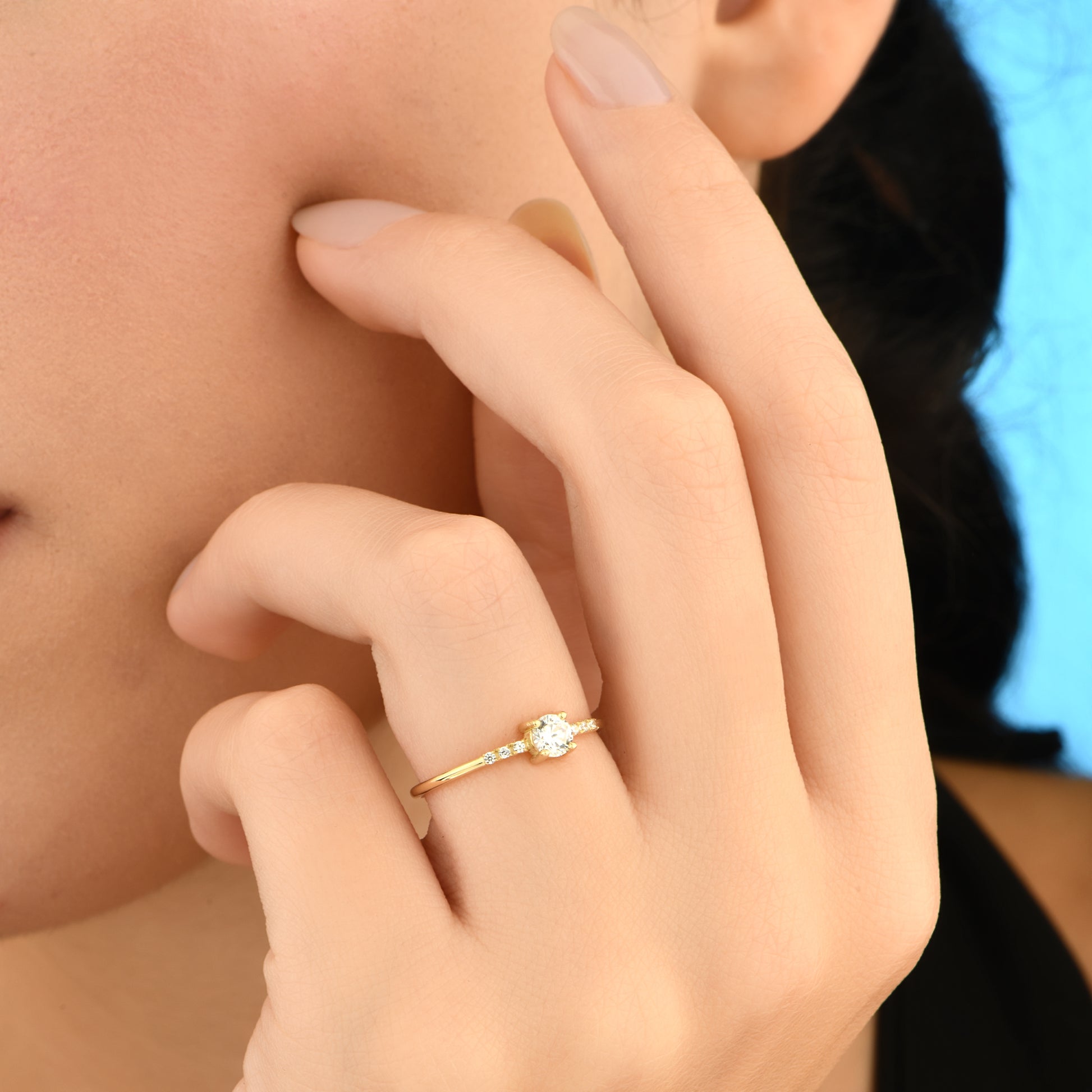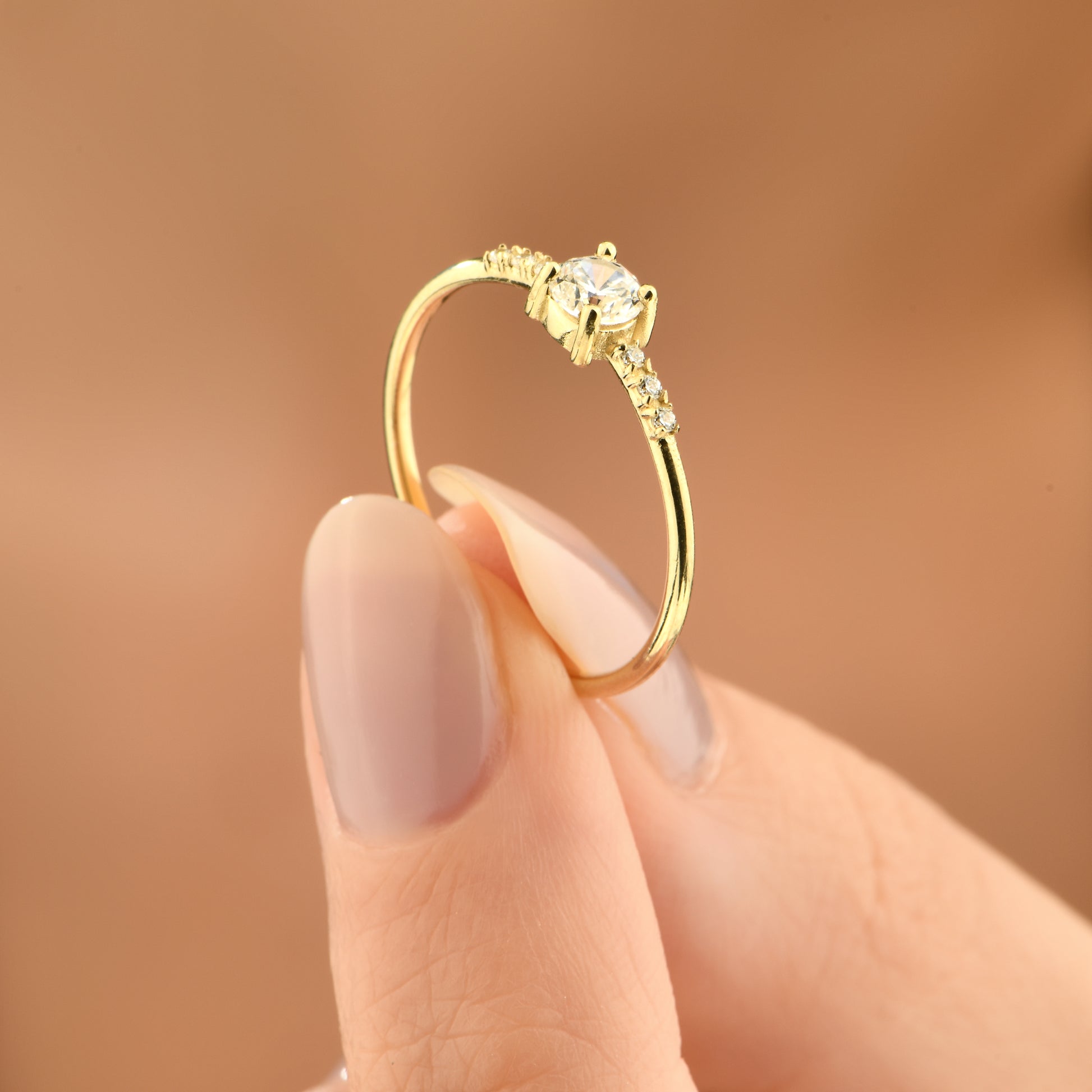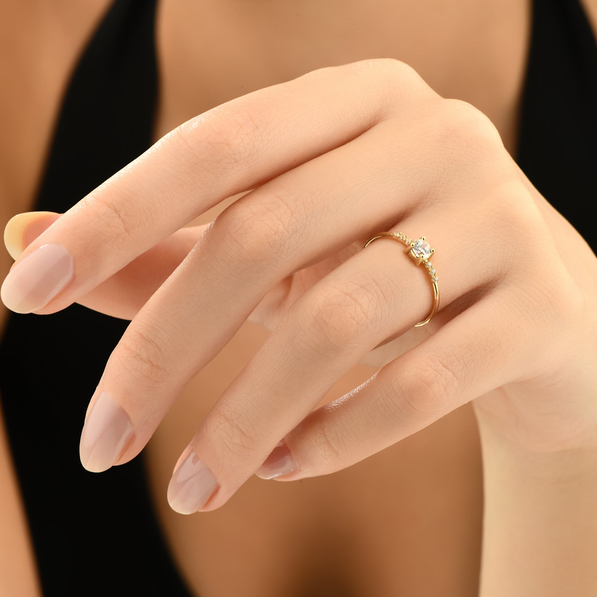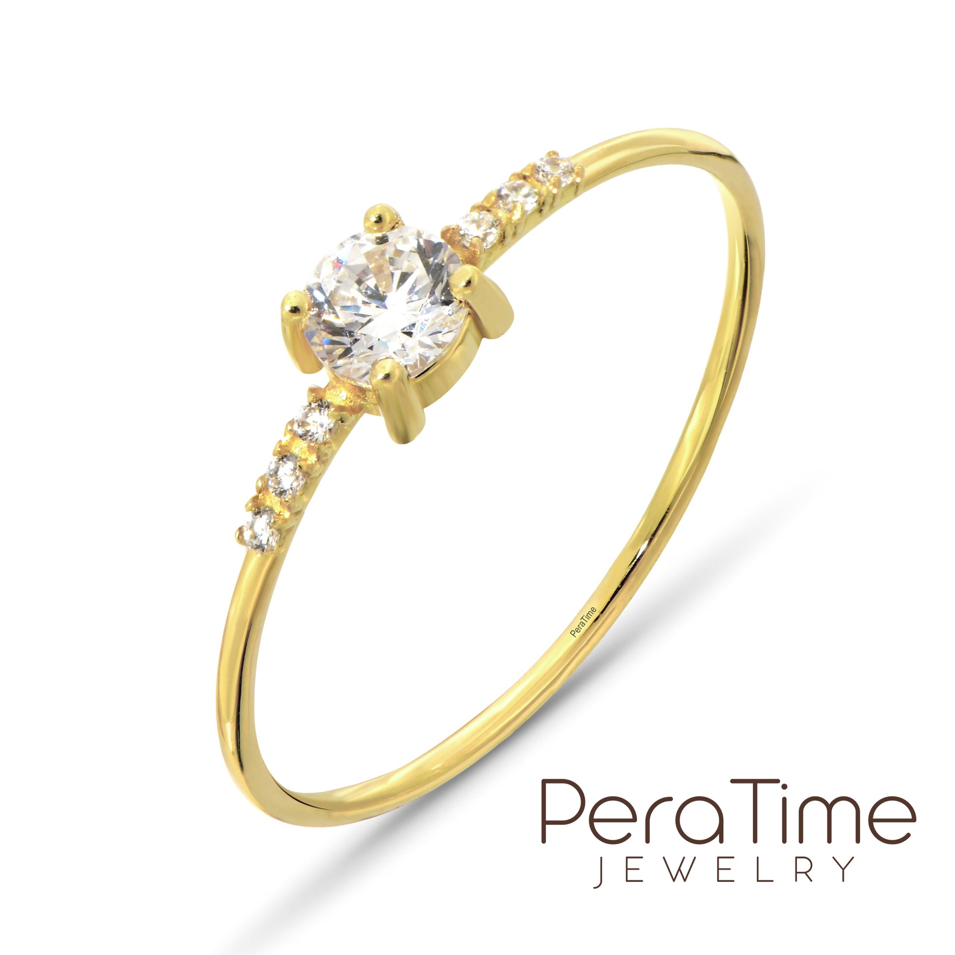 Minimalist ve şık tasarımlı 14 ayar altın yüzük, tektaş zirkon taş detayıyla tamamlanmıştır.